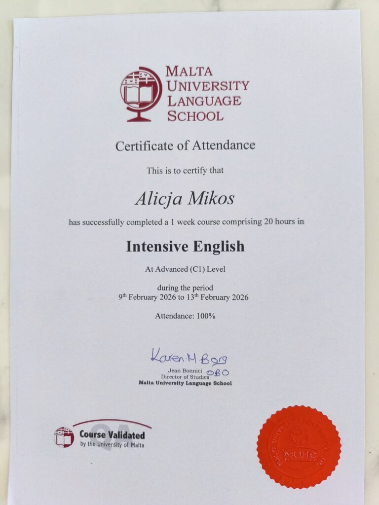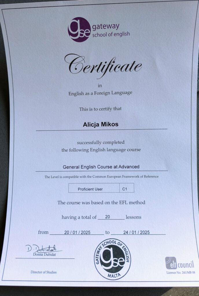 - Doświadczenie międzynarodowe: Uczestniczyłam w zagranicznych kursach językowych na Malcie, gdzie szlifowałam umiejętności w Malta University Language School oraz Gateway School of English (GSE). Kursy te ukończyłam na poziomie C1.
